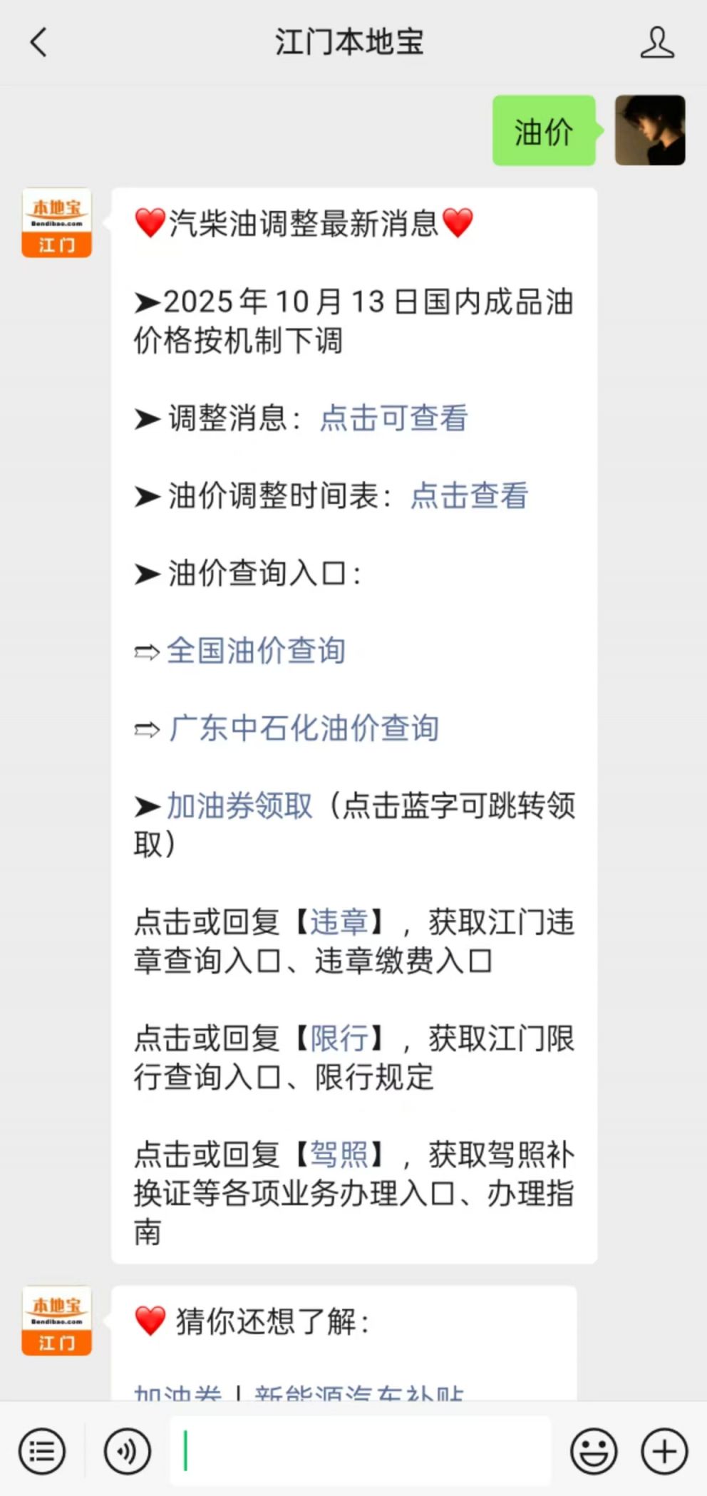 温馨提示:微信搜索公众号【江门本地宝】,关注后在对话框回复【油价】可获取油价查询入口、油价最新调整、附近加油站查询等。