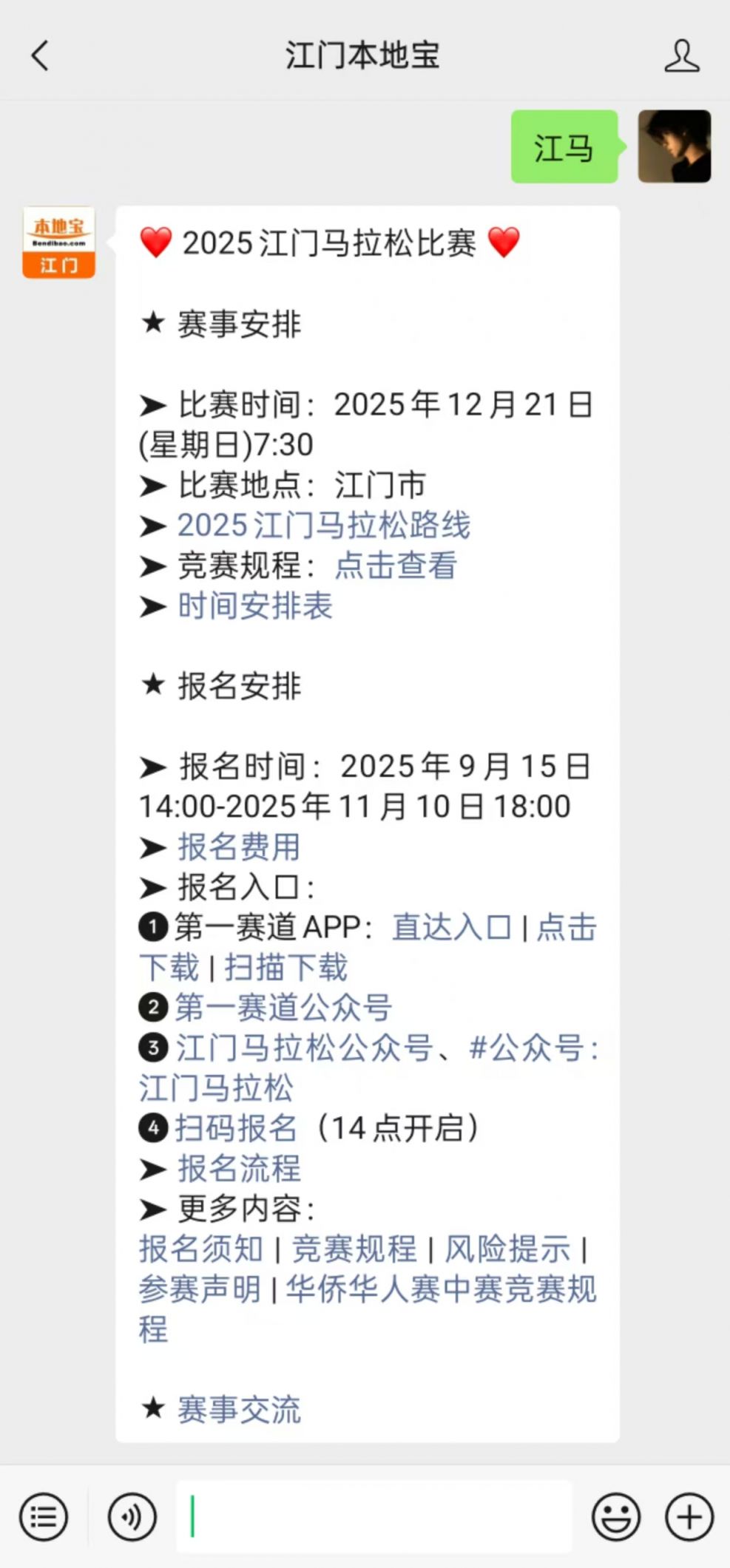 微信搜索公众号【江门本地宝】,关注后在对话框回复【江门马拉松】可获2025江门马拉松官网报名入口、路线图、起终点、参赛品领取、抽签安排、奖金设置